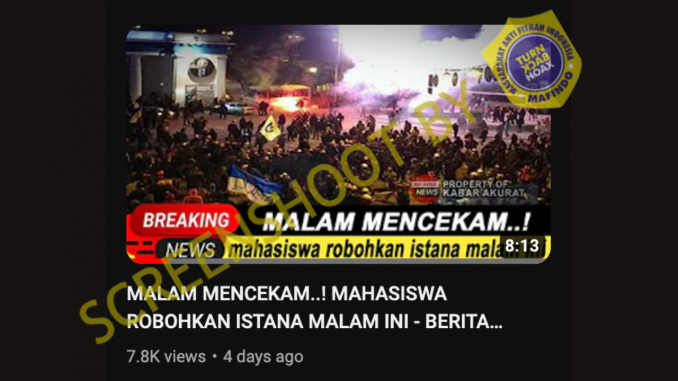 Kanal Youtube Kabar Akurat mengunggah video dengan klaim aksi demonstrasi mahasiwa yang disertai perobohan Istana Negara. Video yang diunggah pada 21 Maret 2023 tersebut sudah ditonton lebih dari tujuh ribu kali.