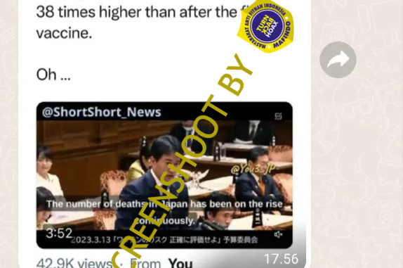 Informasi yang keliru, Menteri Kesehatan Jepang, Katsunobu Kato, mengatakan hanya ada satu kasus kematian di Jepang, yang memiliki hubungan dengan vaksin Covid-19. Sejak Covid-19 melanda Jepang mulai Januari 2020 hingga 23 Maret 2023, jumlah kematian akibat virus itu mencapai 73.551 jiwa. Korban tewas akibat Perang dunia 2 di Jepang dilaporkan sebanyak 2,6 juta jiwa.