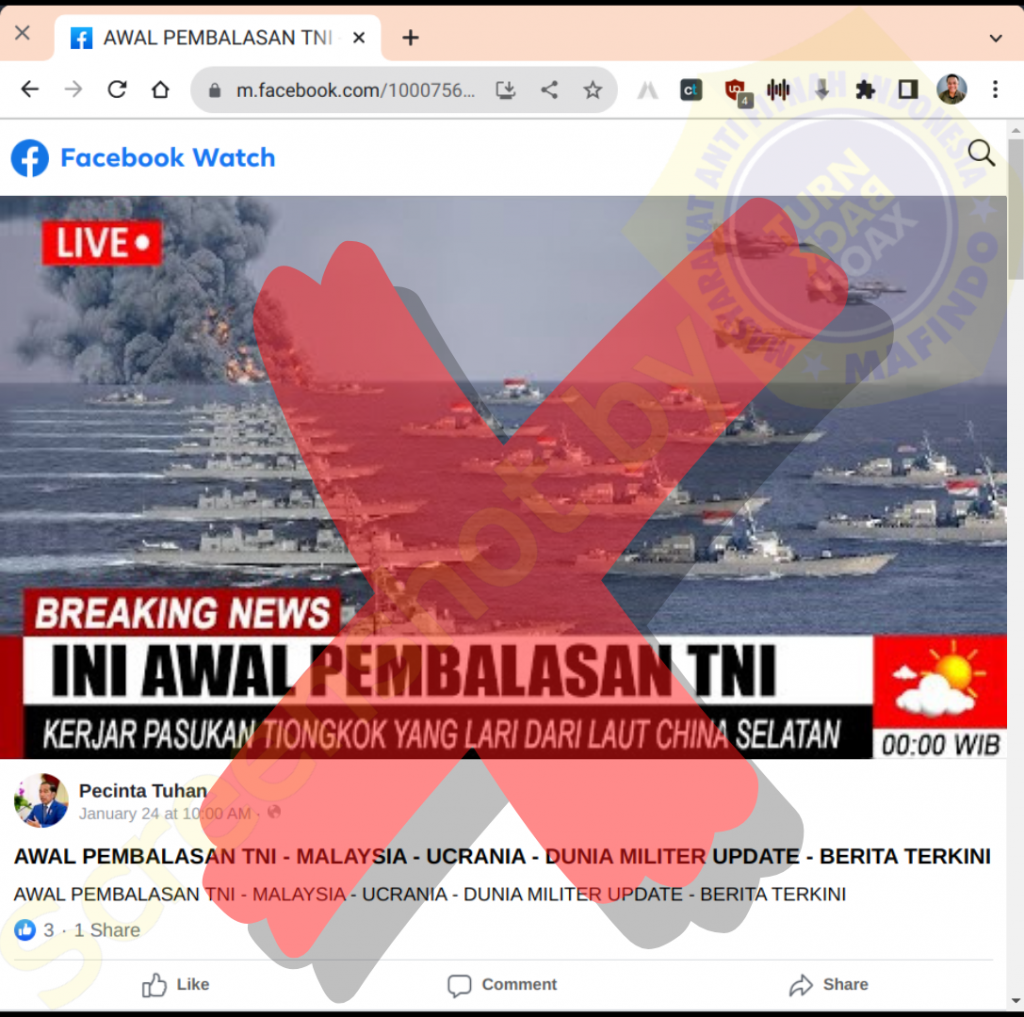 SUMBER membagikan konten yang isinya menimbulkan kesimpulan yang MENYESATKAN, FAKTA: isi video TIDAK berkaitan dengan Malaysia atau Ukraina. Berisi potongan-potongan video yang TIDAK berkaitan, salah satunya adalah video ketika Presiden Joko Widodo menghadiri latihan perang PPRC TNI di Natuna pada tahun 2017 lalu.