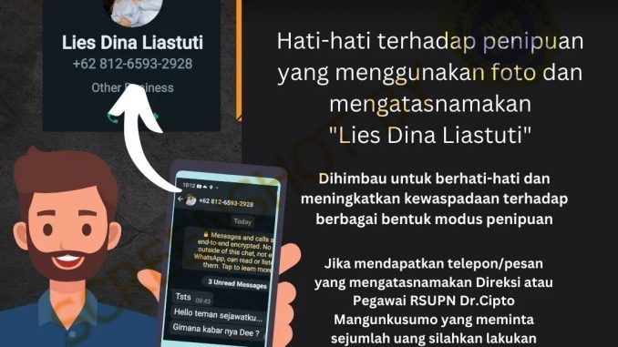 Beredar akun Whatsapp Direktur Rumah Sakit Cipto Mangunkusumo Jakarta, Lies Dina Liastuti dengan nomor “+6281265932928”. Akun tersebut menggunakan nama dan foto profil Lies Dina Liastuti.