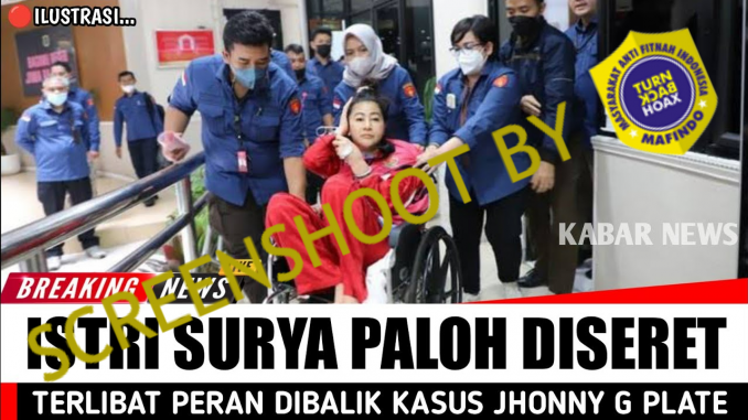 Akun Youtube Kabar news mengunggah video dengan judul: “GEGER PAGI INI || JHONNY G PLATE DAN ISTRI PALOH TERBUKTI SEKONGKOL ??” pada tanggal 22 Mei 2023. Video tersebut menunjukkan tumbnail gambar seorang perempuan yang duduk di kursi roda dengan tulisan “ISTRI SURYA PALOH DISERET, TERLIBAT PERAN DIBALIK KASUS JHONNY G PLATE”.