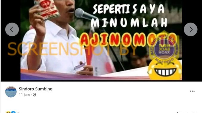 Akun Facebook Sindoro Sumbing memposting sebuah gambar Jokowi yang sedang memegang produk Ajinomoto. Dalam gambar tersebut terdapat narasi jika ingin jenius seperti Jokowi minumlah Ajinomoto. Postingan tersebut diunggah pada 8 Juni 2023 pukul 10.39.