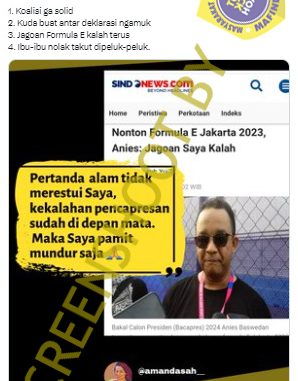 Beredar cuitan dari akun twitter @amandasah__ disertai gambar tangkapan layar dari sindonews.com yang menampilkan Anies Baswedan dengan tambahan narasi yang menyatakan bahwa jagoan Anies di Formula E kalah merupakan pertanda bahwa Anies akan kalah dan Anies pamit mundur dari pencapresan.