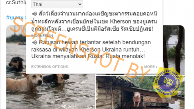 Sebuah cuitan Twitter membagikan foto-foto hewan yang terdampak banjir. Foto-foto tersebut diklaim adalah dampak dari hancurnya bendungan besar di Ukraina akibat dari ledakan yang dilakukan oleh Rusia. Diketahui pada 7 Juni 2023 bendungan era Uni Soviet tersebut jebol usai diguncang beberapa kali ledakan oleh Rusia.