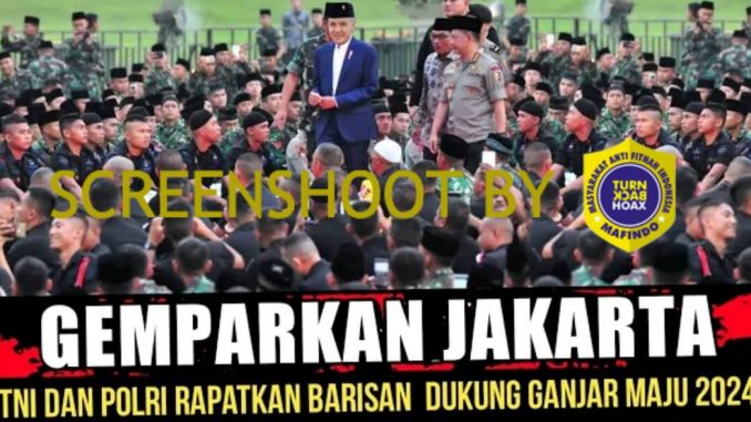 Informasi tidak lengkap.Faktanya, video tersebut adalah acara deklarasi purnawirawan TNI/POLRI bukan Anggota aktif TNI/POLRI. Kegiatan tersebut dilakukan purnawirawan TNI Polri atas dukungannya pada Ganjar Pranowo pada Pemilu 2024.