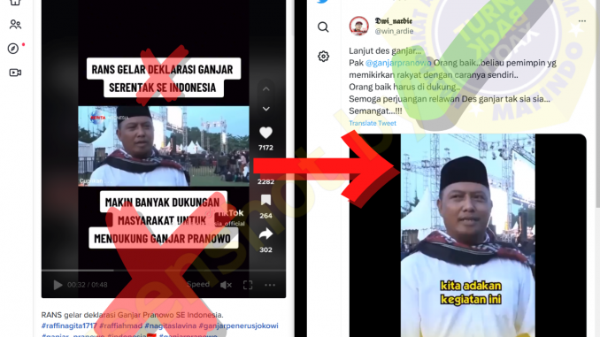 Potongan video lainnya adalah rekaman kegiatan deklarasi Relawan Des Ganjar di kawasan Pantai Bandengan, Jepara, Jawa Tengah. Salah satu sumber dengan video yang identik dengan konteks yang BENAR, ???_?????? di twitter pada 6 Jun 2022: “Lanjut des ganjar… Pak @ganjarpranowo Orang baik..beliau pemimpin yg memikirkan rakyat dengan caranya sendiri.. …”