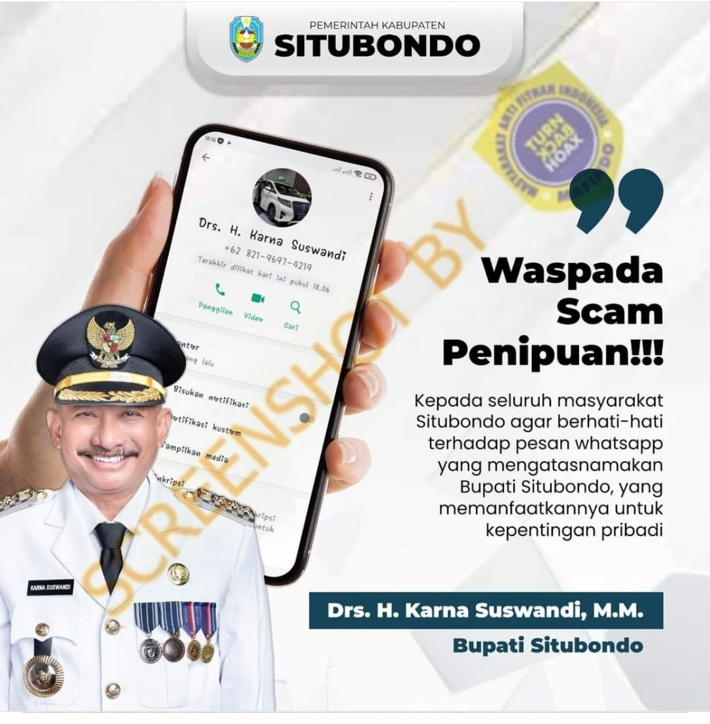 Beredar akun WhatsApp mengatasnamakan Bupati Situbondo dengan nomor +62 82143626610. Akun tersebut memakai nama Karna Suswandi dan menawarkan proram bantuan.