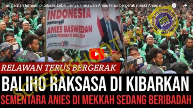 Beredar sebuah video dari channel youtube POLITIK NEGARA yang menampilkan thumbnail gambar kerumunan warga beserta baliho Anies Baswedan bertuliskan “Indonesia memanggil ANIES BASWEDAN SEBAGAI PRESIDEN RI 2024-2029” dengan narasi yang menyatakan bahwa relawan Anies terus bergerak dan kibarkan baliho raksasa meski Anies di Mekkah.