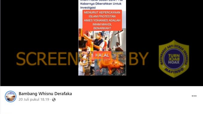 Akun Facebook Bambang Whisnu Derafaka memposting sebuah gambar tangkapan layar berita berjudul “Imam Mahdi Sudah Lahir? FBI Kabarnya Dikerahkan untuk investigasi” pada 20 Juli 2023 pukul 18.19. Pada gambar tersebut juga terdapat gambar gambar Anies dan terdapat narasi “MENURUT KEPERCAYAAN ISLAM PROTESTAN ANIES YOHANIES ADALAH IMAM MAHDI, BENARKAH?”.