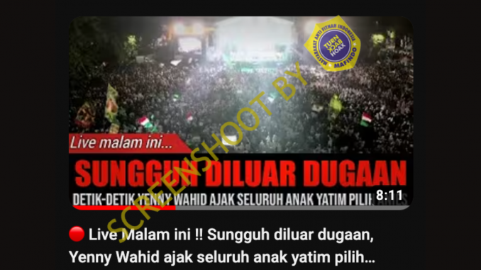 Kanal Youtube LINTAS OPINI mengunggah video dengan klaim Yenny Wahid mengajak seluruh anak yatim untuk mendung Anies Baswedan di pemilihan presiden 2024 mendatang.