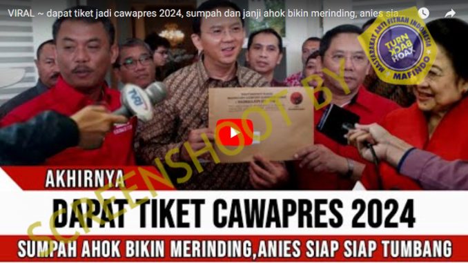 Beredar video yang menarasikan bahwa Basuki Tjahaja Purnama atau Ahok telah mendapatkan tiket untuk menjadi cawapres pada Pilpres 2024. Kabar tersebut beredar dari channel youtube PINTER POLITIK pada 19 Juli 2023.