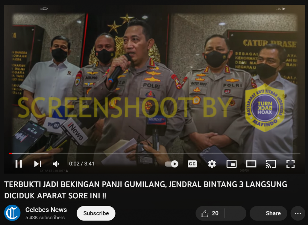Unggahan video sebuah akun youtube dengan klaim bahwa telah tertangkapnya seorang jendral bintang 3 yang terbukti sebagai backingan Panji Gumilamg merupakan informasi yang tidak benar. Unggahan tersebut tidak sesuai baik dari cover dan judul dengan isinya.