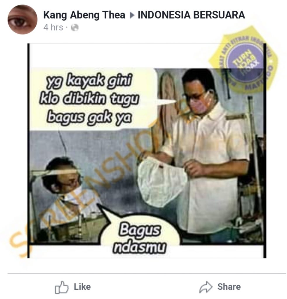 Beredar sebuah gambar yang memperlihatkan Anies Baswedan sedang memegang celana dalam Wanita dihadapan penjahit. Dalam foto tersebut terdapat narasi dimana Anies Baswedan bertanya, “Yang kayak gini kalua dibikin tugu bagus nggak ya?”.
