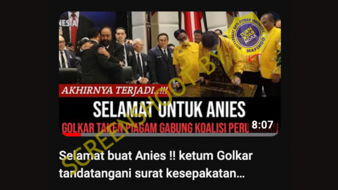 Kanal Youtube DUNIA POLITIK mengunggah video dengan klaim Ketua Umum Partai Golkar Airlangga Hartanto, menandatangani kesepakatan dengan Partai Nasdem, PKS, dan Demokrat. Partai Golkar disebut memutuskan untuk bergabung dengan Koalisi Perubahan.