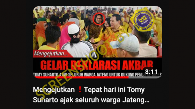 Kanal Youtube GARUDA POLITIK mengunggah video dengan klaim Tommy Soeharto mengajak seluruh warga Jawa Tengah untuk mendukung Anies Baswedan pada Pilpres 2024 mendatang. Dalam gambar pratinjau video, disebutkan bahwa Tommy menggelar deklarasi akbar untuk memberi dukungan penuh kepada Anies.