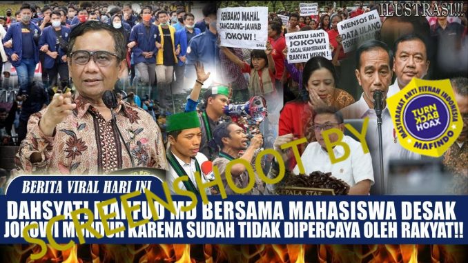 Konten yang menyesatkan. Hasil penelusuran menunjukkan bahwa video merupakan hasil editan kumpulan video yang tidak berkaitan satu sama lain. Tidak ditemukan informasi mengenai Mahfud MD dan Mahasiswa yang mendesak Jokowi untuk mundur karena sudah tidak dipercayai rakyat.