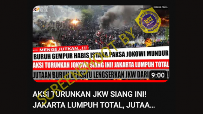 Kanal Youtube Rahasia Politik mengunggah video dengan klaim terjadi aksi demonstrasi yang mengakibatkan Jakarta lumpuh total. Dalam judul video disebutkan bahwa demonstrasi yang dilakukan oleh jutaan buruh ini bersatu untuk melengserkan Presiden Joko Widodo dari istana.