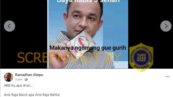 Akun Facebook Ramadhan Sitepu memposting sebuah gambar Anies yang sedang memegang produk Sasa. Dalam gambar tersebut terdapat narasi “Saya habis 5 sehari, Makanya ngomong gue gurih”. Postingan tersebut diunggah pada 20 Agustus 2023.