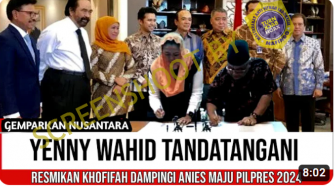 Akun YouTube Suara Rakyat Indonesia pada 16 Agustus 2023 mengunggah video dengan judul “DIRESMIKAN SORE INI !! YENNY WAHID SEPAKATI KHOFIFAH DAMPINGI ANIES 2024”. Judul tersebut tidak sesuai dengan isi dari video yang diunggah. Video yang berdurasi 8 menit 1 detik itu tidak membahas tentang penandatangani peresmian Khofifah menjadi pendamping Anies oleh Yenny Wahid. Judul dan cover yang ada dalam unggahan tersebut tidak sesuai dengan isi narasi dalam video.