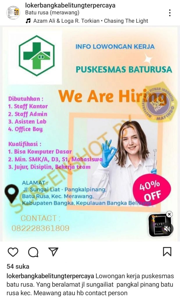 Beredar informasi lowongan pekerjaan di Puskesmas Baturusa Kabupaten Bangka pada akun Instagram @lokerbangkabelitungterpercaya dengan kualifikasi pendidikan SMA/SMK hingga D3 maupun S1 sebagai staf administrasi, asisten dan penjaga lab, serta OB. Dalam poster tersebut mencantumkan alamat Puskesmas untuk mengirimkan lamaran pekerjaan.