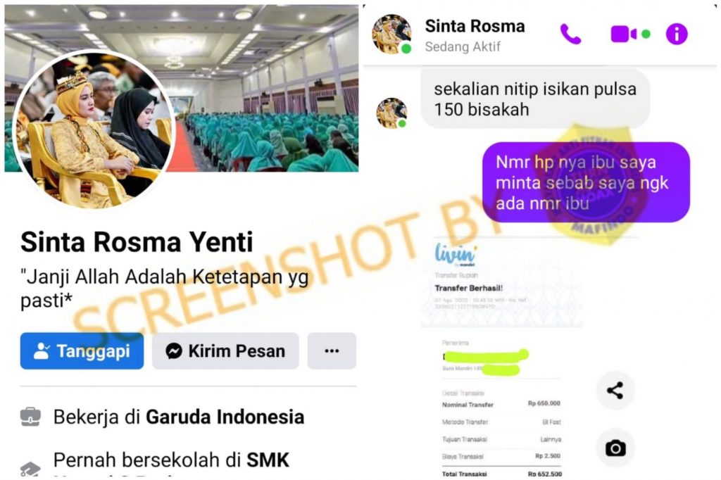 Faktanya Sinta Rosma Tenti tidak pernah menghubungi seseorang melalui messenger dan tidak pernah meminta apapun.