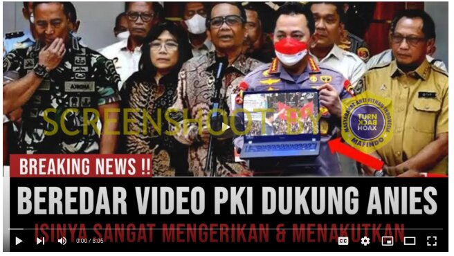 Beredar sebuah unggahan Youtube yang mengklaim Anies Baswedan didukung oleh Partai Komunis Indonesia (PKI). Unggahan itu menampilkan thumbnail dengan foto Kapolri Listyo Sigit Prabowo tengah menunjukan bukti video dukungan PKI kepada Anies. Disampingnya terlihat Jokowi dan Ma’ruf Amin seolah-olah sedang menyaksikan video dukungan PKI kepada Anies Baswedan. Faktanya, unggahan tersebut adalah hasil manipulasi.