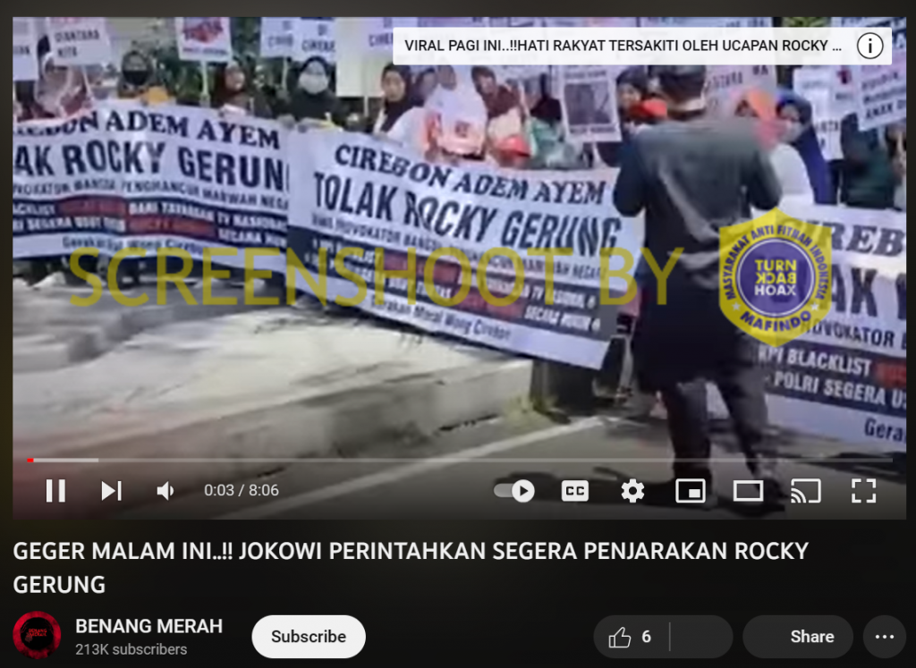 Pada 13 Agustus 2023 sebuah channel youtube dengan nama Benang Merah (https://www.youtube.com/@benangmerah5232) mengunggah sebuah video dengan klaim Presiden Joko Widodo memerintahkan aparat untuuk segera memenjarakan Rocky Gerung seorang akademisi dan pengamat politik yang diduga melakukan penghinaan terhadap Jokowi.