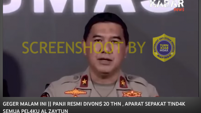 Pada 16 Agustus 2023 sebuah channel youtube dengan nama Kabar News (https://www.youtube.com/@kabarnews672) mengunggah sebuah video dengan klaim Panji Gumilang pemilik dari pesantren Al Zaytun telah resmi divonis penjara selama 20 tahun bahkan aparat setuju untuk menindak seluruh pelaku yang terlibat dalam pondok pesantren Al Zaytun.