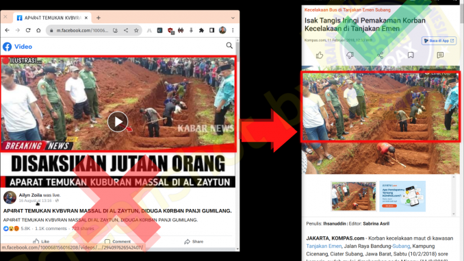 Salah satu sumber foto dengan konteks yang BENAR yang identik dengan foto pratinjau yang digunakan oleh SUMBER, KOMPAS.com pada 11 Feb 2018: “Korban kecelakaan maut di kawasan Tanjakan Emen, Jalan Raya Bandung-Subang, Kampung Cicenang, Ciater Subang, Jawa Barat, Sabtu (10/2/2018) sore kemarin, sudah mulai dimakamkan pada Minggu (11/2/2018) siang ini