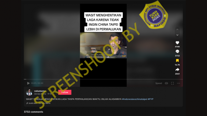 Akun TikTok ratuneme mengunggah video dengan klaim wasit sengaja menghentikan pertandingan sepakbola antara Timnas Indonesia melawan China Taipei atau Taiwan karena kasihan dan tidak ingin Taiwan lebih dipermalukan. Laga tersebut dihentikan tanpa tambahan waktu atau injury time karena wasit tidak tega melihat tim Taiwan telah kebobolan sembilan gol tanpa balas.