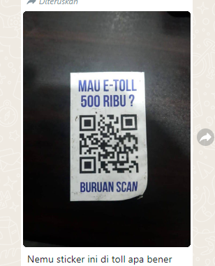 Beredar sebuah sticker berisikan barcode yang tersebar di beberapa pintu toll. Pada sticker tersebut terdapat ajakan untuk melalukan scan terhadap barcode dan akan mendapatkan E-toll senilai 500 ribu rupiah.