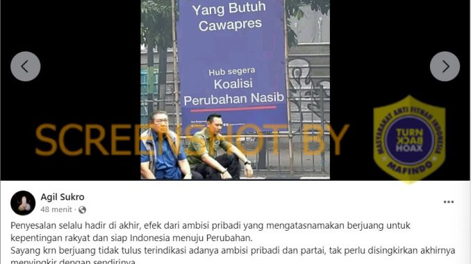 Akun Facebook Agil Sukro memposting sebuah gambar SBY dan AHY sedang duduk di depan baliho bertuliskan “Dicari Capres Yang Butuh Cawapres Hub segera Koalisi Perubahan Nasib”. Gambar tersebut di posting pada 8 September 2023.
