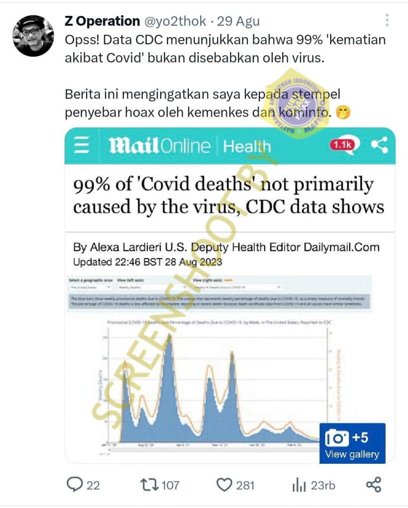 Sebuah akun Twitter @yo2thok mengunggah tangkapan layar dari artikel dailymail.co.uk yang berjudul “99% of ‘Covid deaths’ not primarily caused by the virus, CDC data shows (terjemahan : Data CDC menunjukkan bahwa 99% ‘kematian akibat Covid’ bukan disebabkan oleh virus.” Ia memberikan keterangan tambahan yang menegaskan bahwa di 99% kematian di Amerika bukan karena Covid.