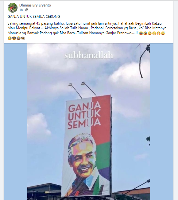 Sebuah akun Facebook mengunggah foto yang memperlihatkan sebuah baliho dengan wajah Ganjar Pranowo bertuliskan ganja untuk semua. Dalam narasinya, akun tersebut mengklaim bahwa pembuat baliho melakukan salah tulis nama.