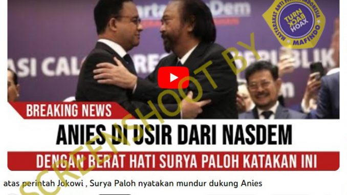 Sebuah video bernarasikan Surya Paloh nyatakan mundur dukung Anies atas perintah Jokowi beredar dari channel youtube PINTER POLITIK pada 19 September 2023.