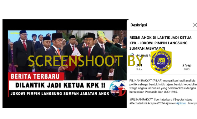 Akun Youtube “Pilihan Rakyat” pada tanggal 2 September 2023 mengunggah sebuah video dengan klaim Ahok resmi dilantik menjadi ketua KPK. Dalam thumbnail digambarkan Basuki Tjahaja Purnama (Ahok) melakukan sumpah jabatan yang dipimpin langsung oleh Presiden Jokowi.