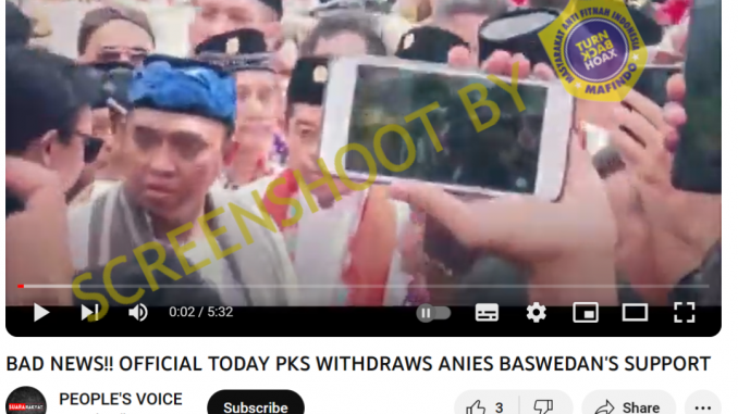 Akun YouTube Suara Rakyat pada 11 September 2023 mengunggah video dengan judul “KABAR BURUK!!! RESMI HARI INI PKS MENARIK DUKUNGAN ANIES BASWEDAN”. Judul tersebut tidak sesuai dengan isi dari video yang diunggah. Video yang berdurasi 5 menit 32 detik itu tidak menyampaikan narasi yang menyatakan bahwa PKS resmi menarik dukungannya kepada Anies Baswedan. Judul dan narasi yang disampaikan dalam unggahan tersebut berbeda dan malah bertentangan. Pernyataan dalam judul mengatakan PKS resmi mengundurkan diri akan tetapi dalam narasi yang disampaikan PKS bahwa kabar tersebut tidak benar.