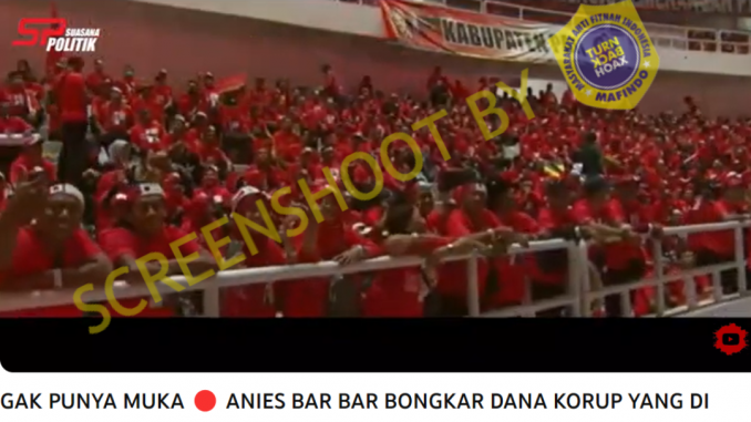 Akun Suasana Politik Indonesia pada 17 September 2023 mengunggah video dengan judul GAK PUNYA MUKA :red_circle: ANIES BAR BAR BONGKAR DANA KORUP YANG DI LAKUKAN PD1P”. Unggahan yang berdurasi 8 menit 1 detik itu tidak menyampaikan narasi yang menyatakan bahwa Anies membongkar dana korupsi yang dilakukan oelh PDIP. Unggahan tersebut juga menampilkan beberapa cuplikan video dari acara Mata Najwa pada episode membahas korupsi dana bansos.