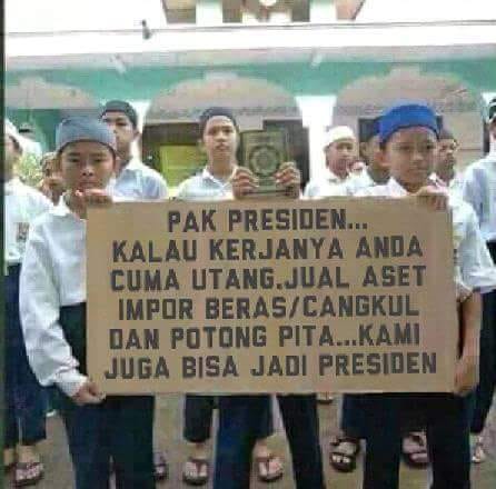 Di dalam foto tersebut terlihat beberapa murid SMP sedang membentangkan spanduk bertuliskan “PAK PRESIDEN… KALAU KERJANYA ANDA CUMA UTANG. JUAL ASET IMPOR BERAS/CANGKUL DAN POTONG PITA… KAMI JUGA BISA JADI PRESIDEN.