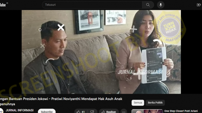 Kanal YouTube JURNAL INFORMASI (https://www.youtube.com/@jurnaliser) pada 4 Agustus 2023 mengunggah video yang mengklaim bahwa Presiden Joko Widodo membantu YouTuber penolong Orang dengan Gangguan Jiwa (ODGJ), Pratiwi Noviyanthi, untuk mendapatkan kembali hak asuh bayi yang dirawatnya setelah Dinas Sosial (Dinsos) mengambil alih dan menjemput paksa bayi-bayi tersebut.