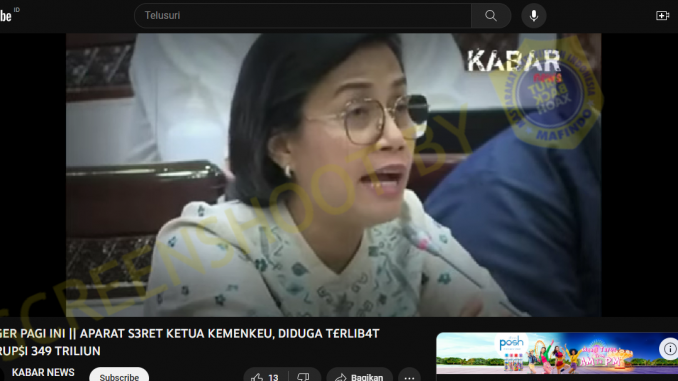 Kanal YouTube KABAR NEWS (https://www.youtube.com/@kabarnews672) pada 21 September 2023 mengunggah video dengan judul yang mengklaim bahwa Menteri Keuangan, Sri Mulyani, diduga terlibat kasus korupsi sebesar Rp 349 triliun. Dalam thumbnail video pun tertulis bahwa Sri Mulyani telah terlibat kasus korupsi ini selama 2 tahun.