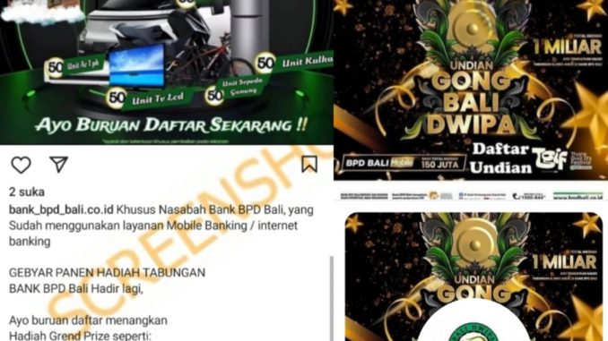 Beredar sejumlah akun Facebook maupun Instagram mengatasnamakan Bank BPD Bali. Akun-akun tersebut mengunggah postingan gebyar panen hadiah Bank BPD Bali dengan berbagai hadiah menarik. Saat di klik tautan tersebut akan diarahkan ke pesan WhatsApp.