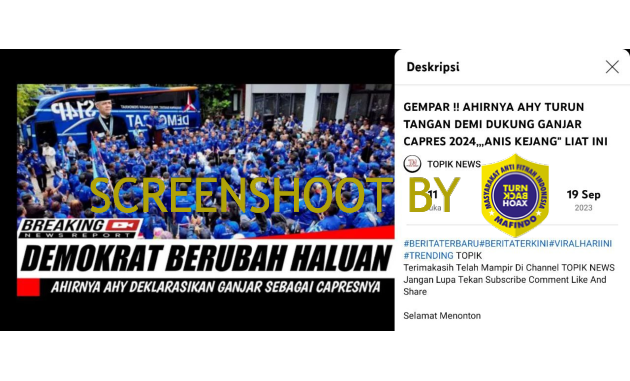 Sebuah akun Youtube dengan nama pengguna “TOPIK NEWS” mengunggah video dengan klaim bahwa AHY turun tangan demi dukung Ganjar sebagai capres 2024. Faktanya tidak ada bukti valid ataupun pernyataan resmi mengenai hal tersebut.