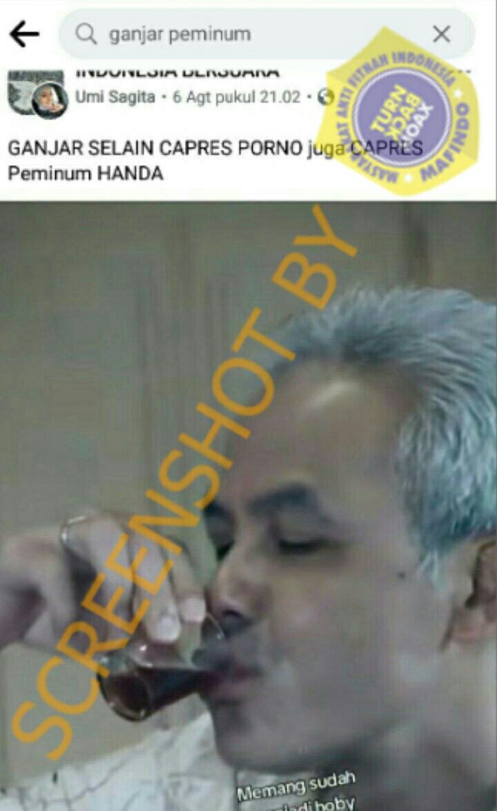 Beredar kembali unggahan yang menyebutkan bahwa calon presiden RI, Ganjar Pranowo, merupakan seorang peminum alkohol. Kali ini sebuah video yang disebarkan oleh akun bernama Umi Sagita melalui Grup Facebook Indonesia Bersuara. Tampak Ganjar meneguk minuman berwarna kecokelatan dari sebuah gelas kecil. Akun ini kemudian menambahkan narasi yang berbunyi: “GANJAR SELAIN CAPRES PORNO juga CAPRES Peminum HANDAL”.