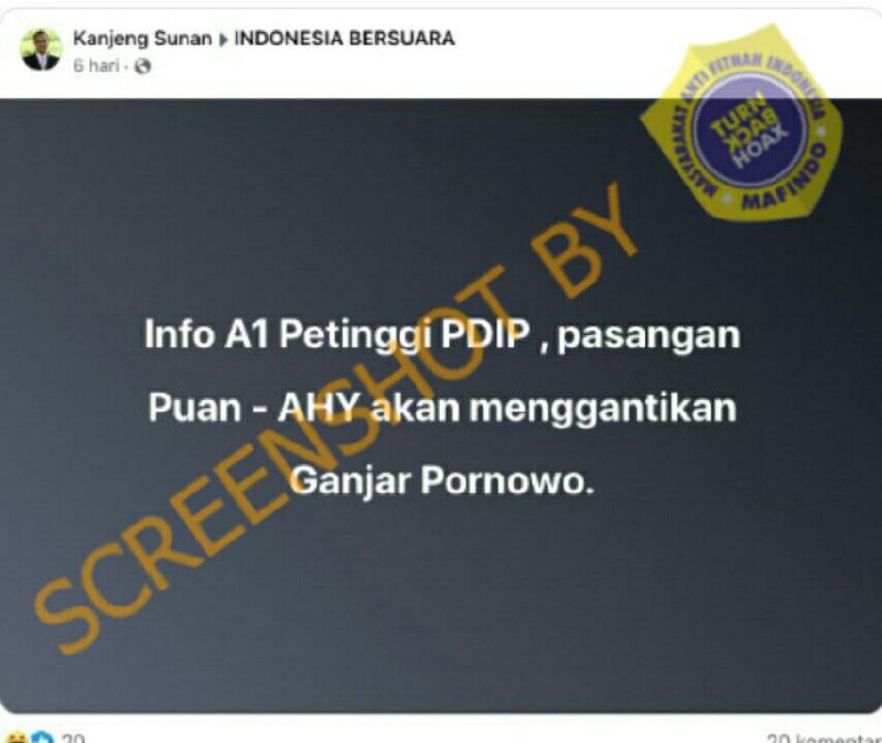 Beredar sebuah unggahan melalui media sosial Facebook, tentang informasi yang menyatakan bahwa pasangan Puan Maharani dengan Agus Harimurti Yudhoyono (AHY) akan menggantikan pasangan Ganjar Pranowo sebagai calon presiden pada Pemilu 2024 mendatang. Akun Facebook bernama ini mengklaim pula bahwa informasi ini merupakan informasi A1, yang biasa diartikan sebagai informasi terpercaya. Apakah benar Puan-AHY akan maju dalam Pilpres 2024 menggantikan Ganjar Pranowo?