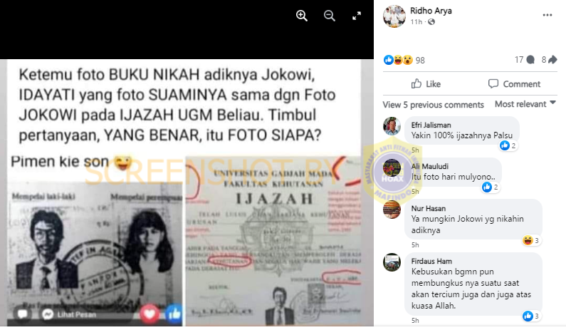 Beredar di Facebook sebuah postingan berisi gambar yang memperlihatkan copy dari buku nikah dan ijazah. Buku nikah tersebut diklaim milik Adik dari Jokowi, Idayati dengan mantan suaminya, dan foto pria tersebut sama persis seperti yang tertera pada foto ijazah milik Jokowi saat kuliah di Universitas Gadjah Mada (UGM).