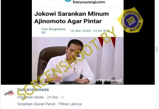 Beredar sebuah tangkapan layar artikel yang berjudul “Jokowi Sarankan Minum Ajinomoto Agar Pintar,” pada platform Facebook. Artikel itu dimuat oleh Ringtimesbanyuwangi.com pada 18 Mei 2020. Faktanya, isi artikel tersebut adalah hasil cek fakta terkait isu Jokowi sarankan minum Ajinomoto agar pintar.