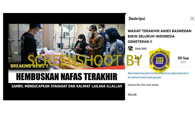 Sebuah akun Youtube dengan nama pengguna “DUA SISI” mengunggah video dengan klaim bahwa Anies menghembuskan nafas terakhir dan beri wasiat terakhir. Faktanya tidak ada bukti kredibel mengenai hal tersebut.