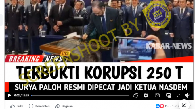 Hasil periksa fakta Ummul Hidayah. Unggahan video dengan klaim Surya Paloh dipecat jadi Ketua Nasdem karena kasus korupsi 200 T di Kementerian Pertanian. Judul dan cover pada unggahan tersebut telah dimanipulasi tidak sesuai dengan narasi yang disampaikan dalam unggahan tersebut.