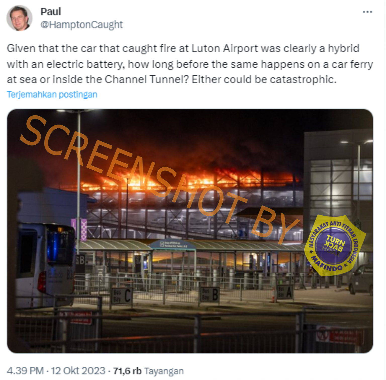 Beredar sebuah informasi yang mengklaim kebakaran besar di Bandara Luton, Inggris pada 10 Oktober 2023 akibat dari ledakan mobil hybrid dengan baterai listrik. Dalam postingan yang menunjukkan video kebakaran tersebut juga mengkhawatirkan bagaimana jika ledakan mobil listrik terjadi di kapal feri pengangkut mobil atau di sebuah terowongan.